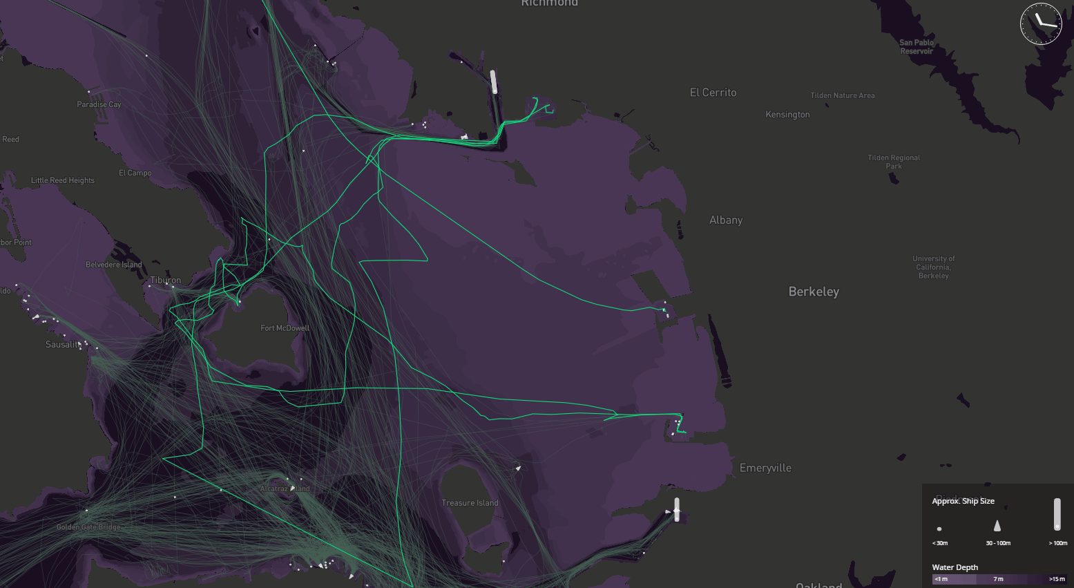 How do big ships navigate the San Francisco Bay? The tracks on this map show telemetry data from 24 hours of activity archived by the U.S. Coast Guard on September 1st, 2014, along with underwater bathymetry (depth) data provided by NOAA. Ship telemetry data has been anonymized by the USCG, so relative ship sizes are approximated based on their general behavior.
