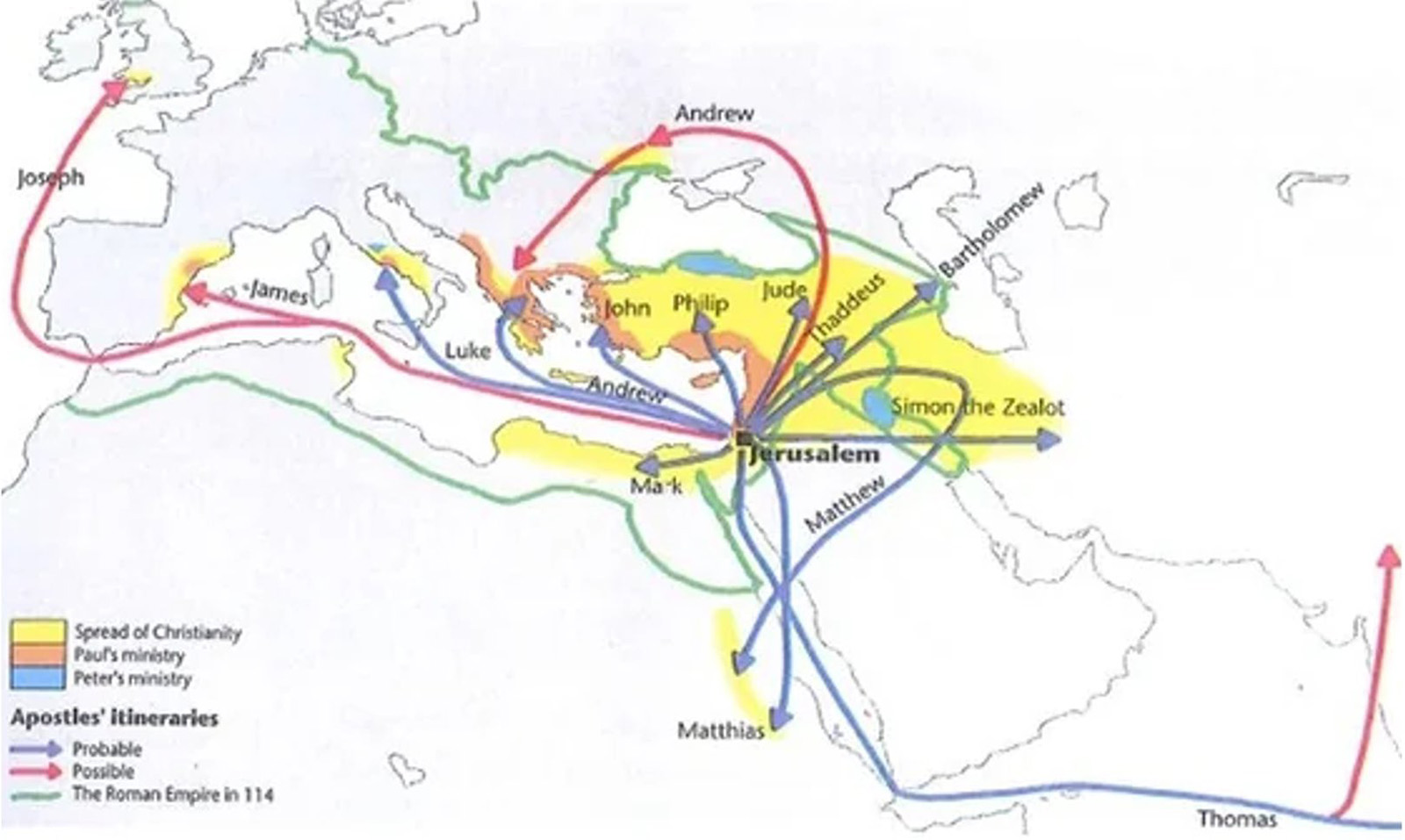 The second map traces the routes tied to each apostle. Purple arrows indicate routes with stronger support and red arrows mark paths where the evidence is weaker. Green shows the Roman border around 114 AD and yellow highlights areas where Christianity had spread by the early second century.