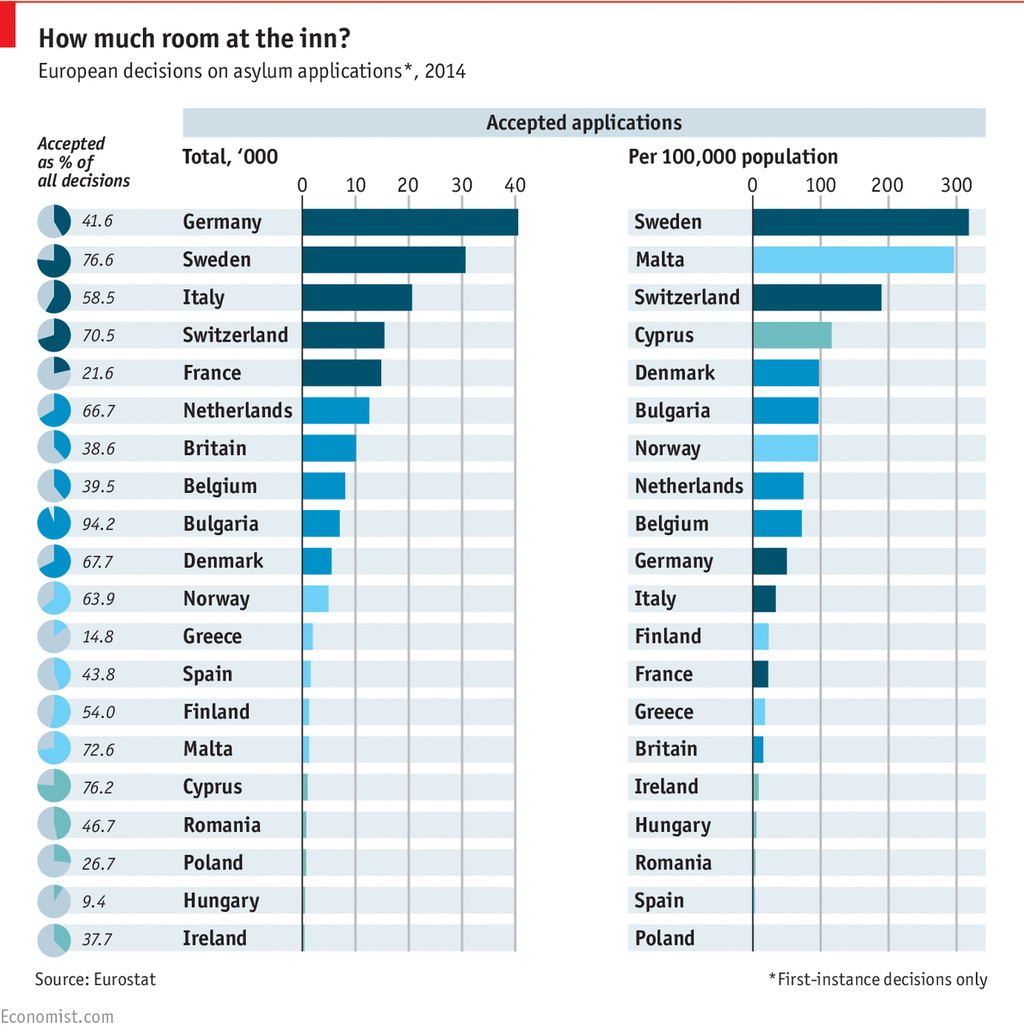 ChartsImmigrationMigration maps Asylum acceptance rate (2014) September 19, 2015 Alex Bulgaria 94% Sweden 77% Germany 42% UK 39% France 22% Hungary 9% Related Posts:Intentional homicide ratePercentage who have not Consumed Alcohol in the last…Mapping Europe's refugee crisisNumber of unaccompanied child migrants seeking…Refugee population by country of asylumMigrant crisis explained in numbers16 Maps That Explain FranceGermany is still divided by east and west