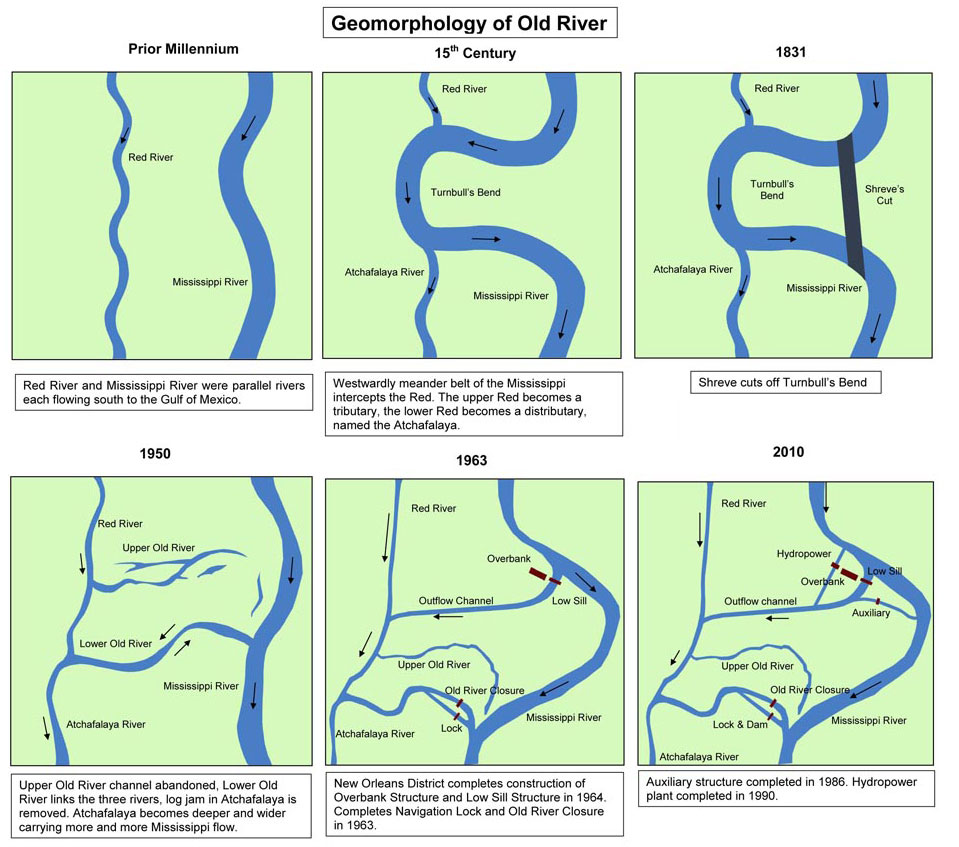 Upper Old River channel abandoned, Lower Old River links the three rivers, log jam in Atchafalaya is removed. Atchafalaya becomes deeper and wider carrying more and more Mississippi flow.