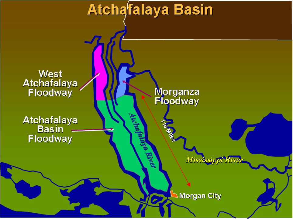 The Atchafalaya River is where the Mississippi River wants to flow. The first map up there is an elevation map, which shows just how the Atchafalaya River is a far superior waterway, since it’s deeper and more direct. People have been doing seriously extensive work for a long time to make sure the Mississippi continues flowing to New Orleans.
