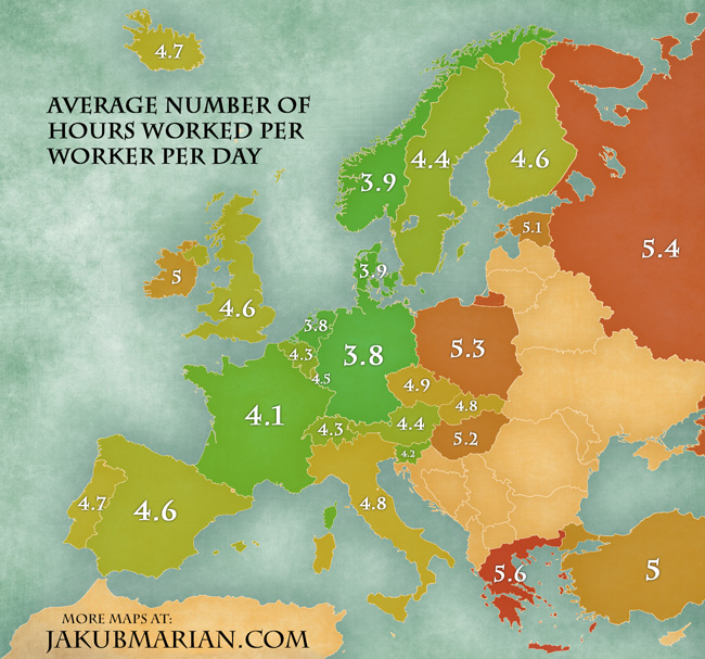Economic maps Average number of hours worked per worker per day August 24, 2015 Alex Related Posts:Annual Sunshine Hours of The WorldAverage hours worked per worker per week (including…Mapped: The Countries Most Addicted To Screen TimeComparing Each State's Highest-Paying Job to the…Insufficient sleep in every US countyHow many hours Americans need to work to pay their mortgageFirst day of the week in different countriesThe Most and Least Expensive American Neighborhoods