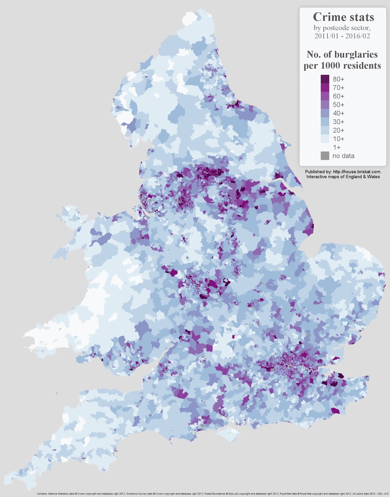 CitiesCrime maps Burglaries across England and Wales per 1000 residents May 9, 2016 Alex Related Posts:Castles of the British IslesThe worst value tourists attractions, according to…Every U.S. State's Favorite Swear WordGun ownership in the United StatesTotal military personnel strength by country in EuropeMaps reveal the places that Americans want to move…National Identity in the United KingdomMap of Europe in 1000 A.D.