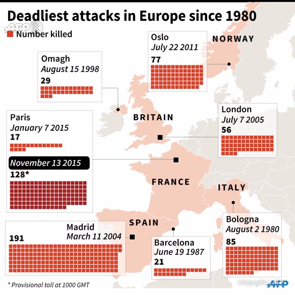 InfographicsNews Deadliest attacks in Europe since 1980 November 14, 2015 Alex Related Posts:New study reveals the states most likely to…Fatal Bear Attacks in North America: Insights from…What the Paris attacks mean for Europe's free bordersDeadliest war in Each European CountryTerrorist Attacks (2017)Over 128 killed, 180 injured in Paris attacksEarthquakes from 1956‒2022, MappedSyria: Who is responsible for how many deaths?