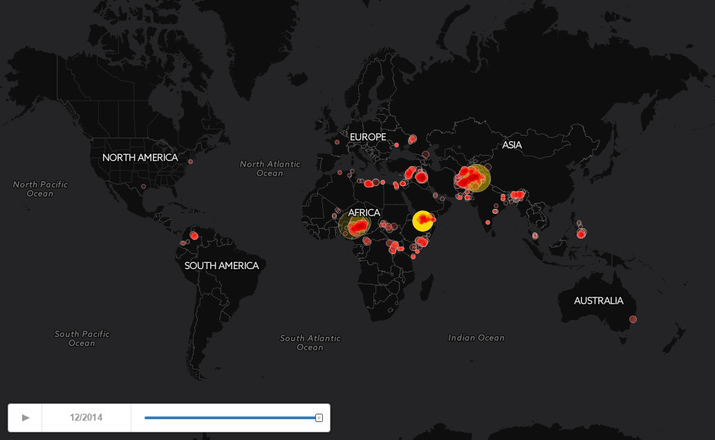 ChartsEmigrationInteractive mapsTerrorism Deaths by terrorism (2001 – 2014) November 28, 2015 Alex Via oregonlive.com Related Posts:Global terrorism index (2015)Midlife “Deaths Of Despair” in the United States…World War II's Human Toll: A Global Tragedy in…The threat level of terrorism around the worldUS gun deaths by populationGun sales in the U.S.Cancer deaths per 100,000 PopulationU.S. Annual Commercial Casino Gaming Revenues (2001 - 2015)