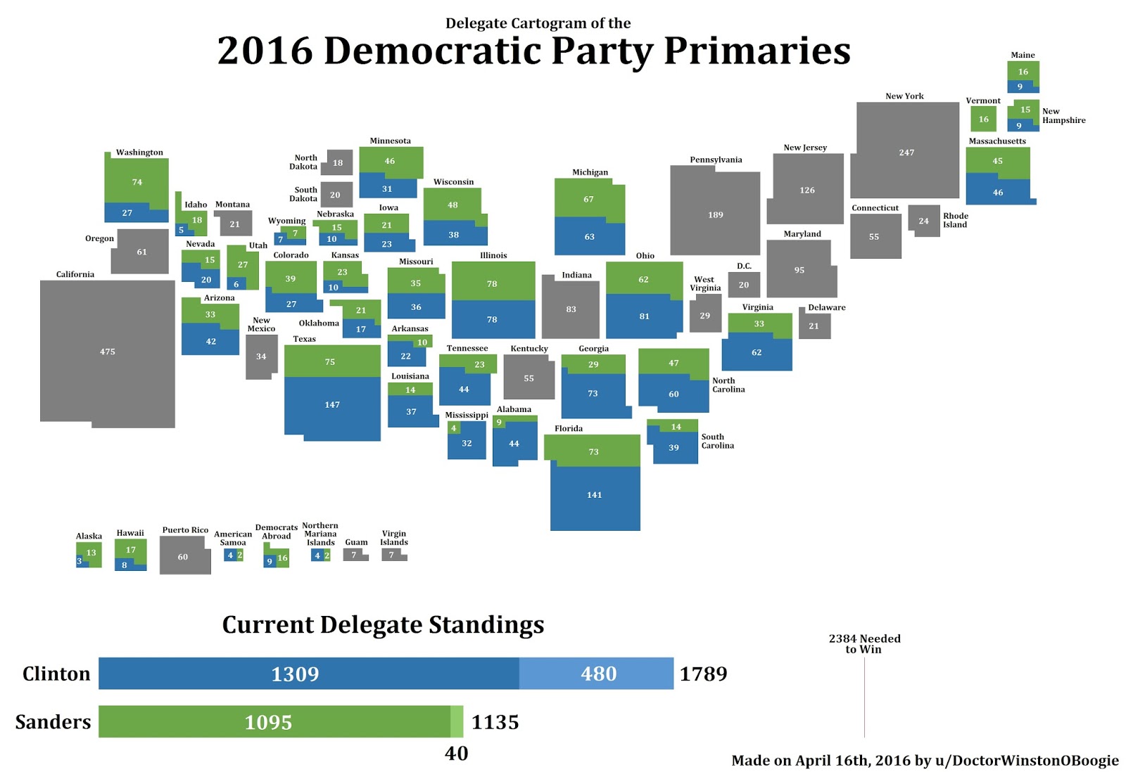 CartogramsPolitical maps Delegate cartogram of the 2016 Democratic party primaries April 16, 2016 Alex Related Posts:2016 U.S. presidential election mappedDutch general election results by Municipality (March, 2017)Random states of AmericaU.S. presidential election results in two maps (2016)Change in margin between 2004 & 2016 electionsResults of the 2016 Democratic & Republican…White Vote in the 2016 U.S. Election3D map of county-level election results