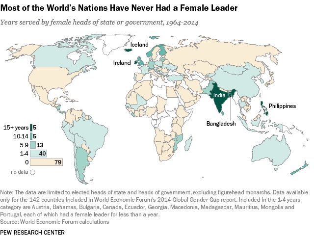 Political mapsWorld Female leaders in the world July 31, 2015 Alex Most of the World’s nations (colored tan on map) have never had a female leader. Just 10 countries had a female leader for at least 10 of the last 50 years. Related Posts:The U.S. States and Metro Areas With the Most…Map of higher education degrees of World country leadersThe Freelancer Pay Gap by U.S. StateThe Most Affordable ZIP Codes to Buy Property in…The Most and Least Expensive American NeighborhoodsWhere did each country's head of government obtain…The most popular dog names around the worldSuicide Rates by Country Mapped