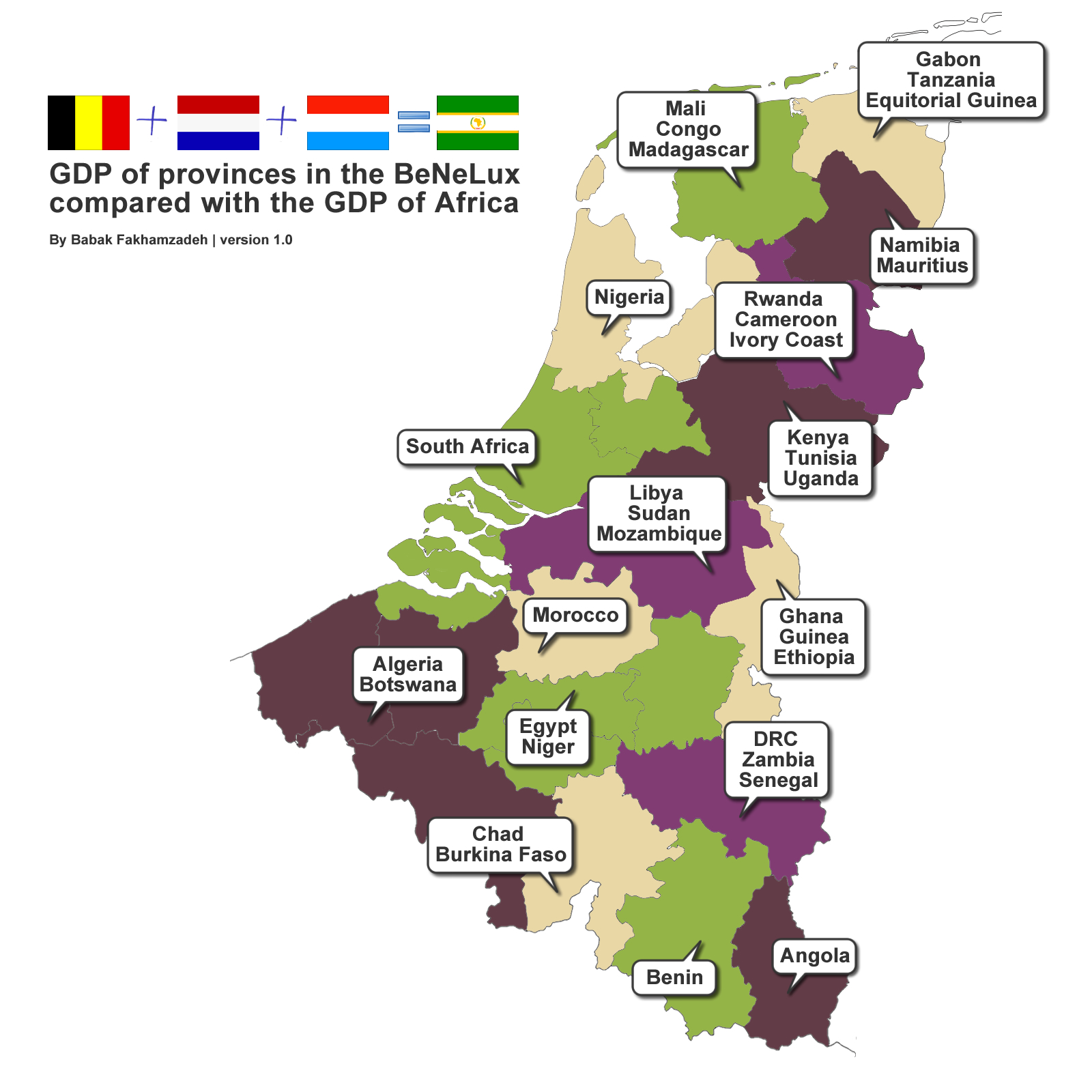 Economic mapsSliderWorld GDP of provinces in the Benelux compared with the GDP of Africa July 1, 2016 Alex Via babakfakhamzadeh.com Related Posts:Atlas of the colonization and decolonization of AfricaGDP per Capita Worldwide MappedWhich countries get the most paid vacation days?Contributors and Receivers of the United States and CanadaRailroads of Africa in the style of Harry Beck's…Nominal and per Capita GDP Cartogram with subdivisionsThe size of Canada compared to the size of other countriesThe Economic Map of America: Understanding U.S. GDP…