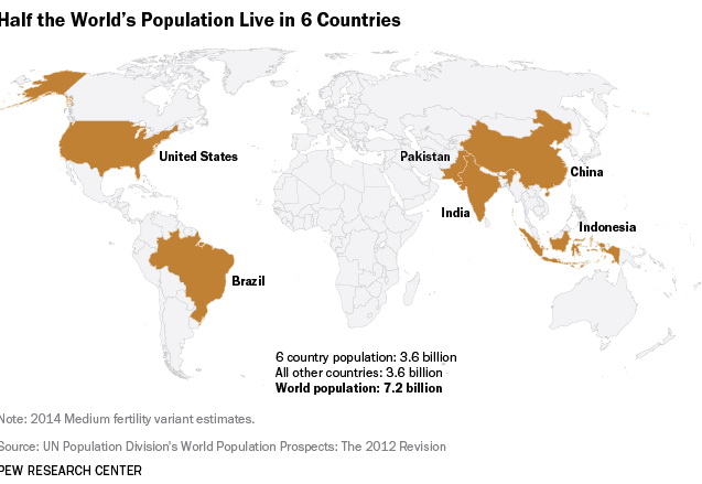 PopulationWorld Half the world’s population live in 6 countries July 10, 2015 Alex Related Posts:The World's Forests MappedHow the World was Imagined: First Maps and Atlases3D Mapping of The Global ClimateHalf of the French live in the blue areasItaly`s population split in halfThe same amount of people live in the black & in the…Half the population of MongoliaThe world with a 70 meters sea-level rise