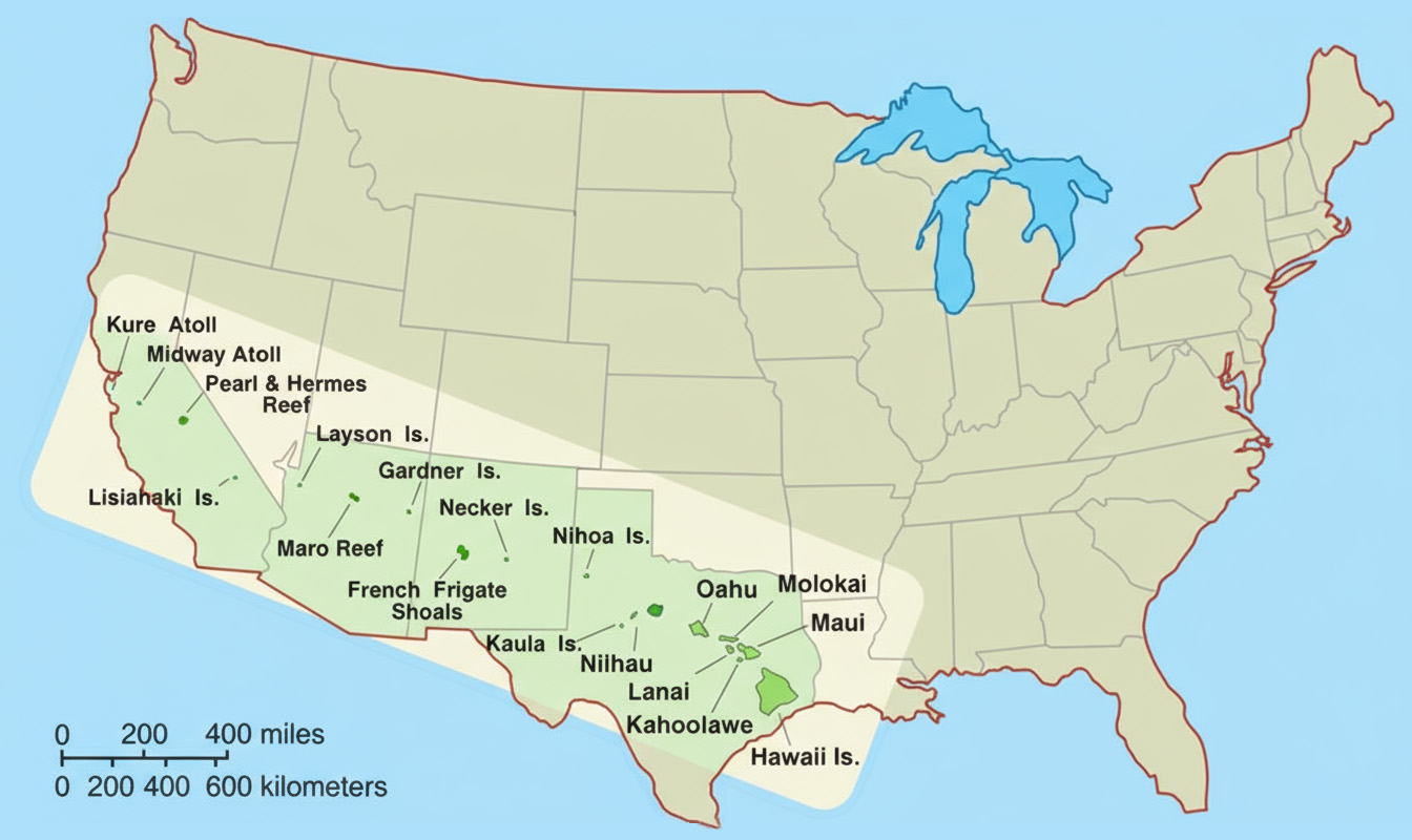 Kure Atoll to the Big Island spans about 2,450 km (1,520 mi) — roughly the distance you’d cover driving from New York to Denver. Tiny atolls and bare rock pinnacles are sprinkled across the northwestern section. Nobody lives on most of them. Some are just pinnacles sticking out of the water. But they anchor Hawaii’s maritime boundaries and extend the state far beyond the main islands.