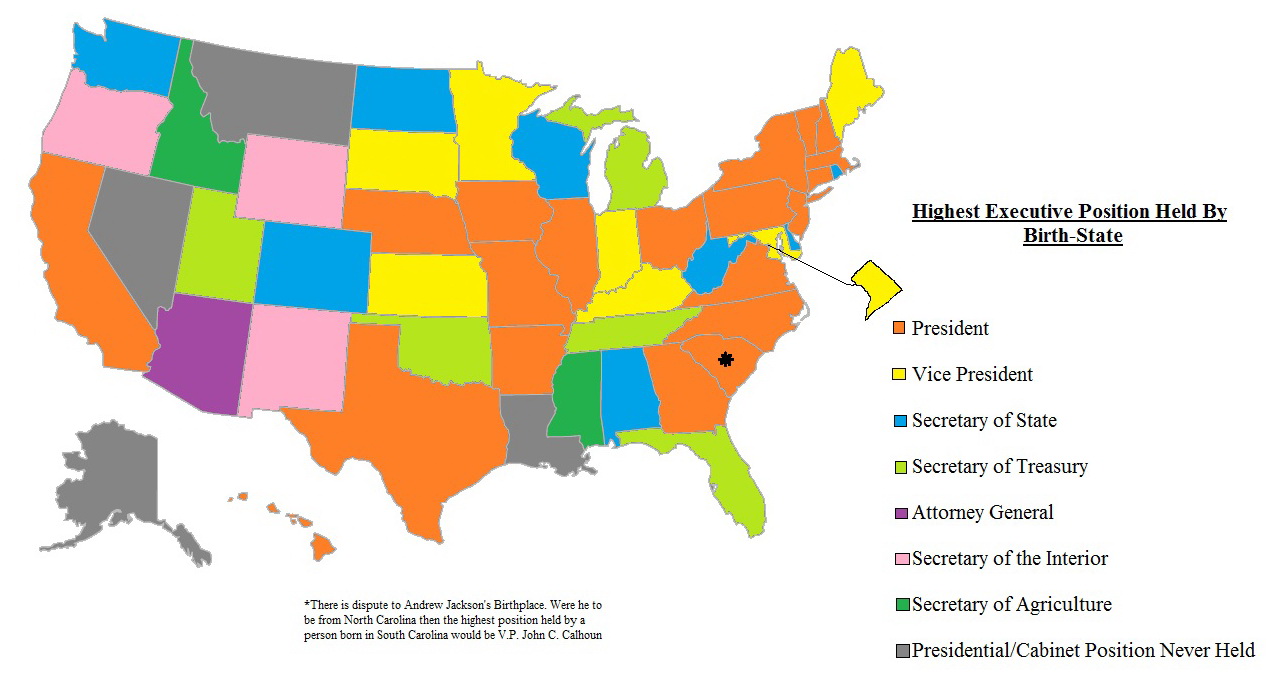 Mapping StereotypesPolitical maps Highest executive position hela by birth-state August 13, 2016 Alex Related post: – Number of presidents born in each US State Related Posts:Where every U.S. President was Born?Predominant Generations by CountryThe Most Profitable Actor Born in Every Country and…Mapping the Ancestry of US Presidents: A Journey…Mapping Interstate MigrationMap showing countries which since independence have…The share of the population born outside the United StatesMaps Reveal Each U.S. state's Biggest Export – and…