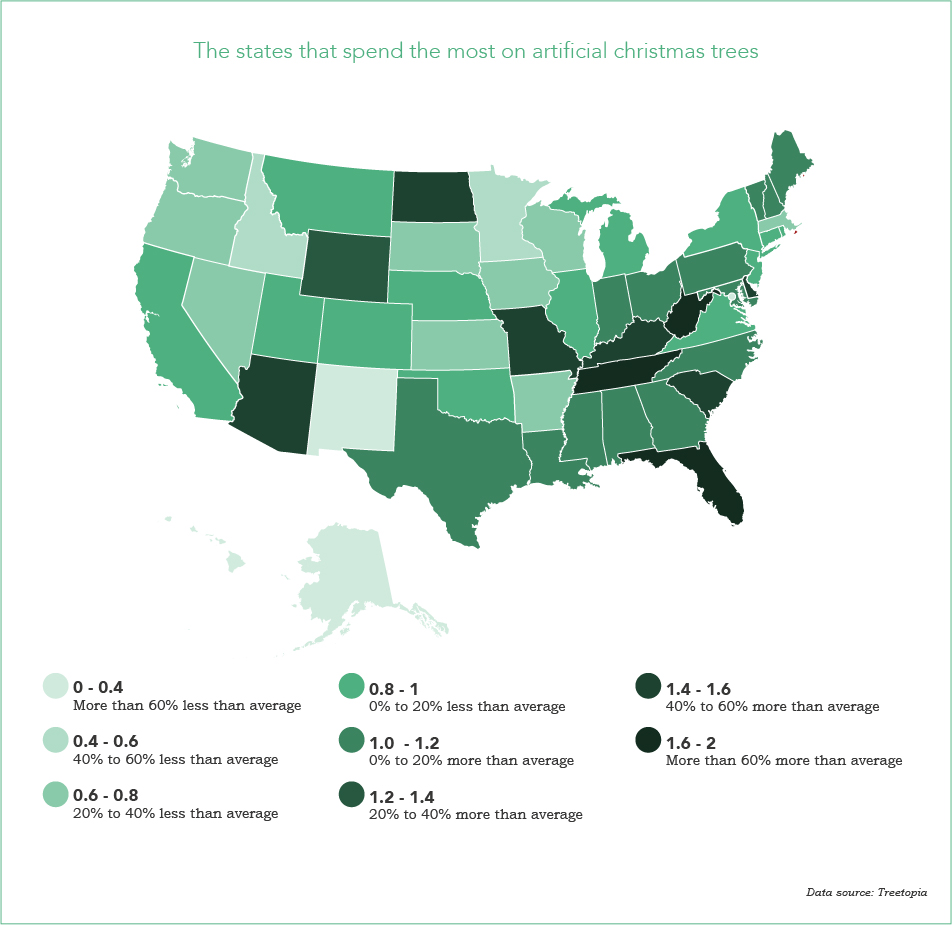 Tennessee, Florida, and West Virginia are the top spenders for artificial Christmas trees. Only 18% of Americans buy the teal thing.
