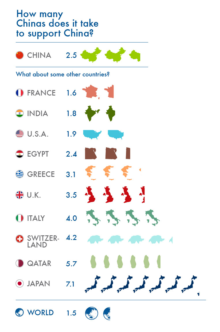 Environment mapsInfographics How many Chinas does it take to support China? July 7, 2015 Alex Related Posts:15 maps that explain ChinaGlobal Trade Dominance: How China Overtook the EU…How Population of Different Countries Fit into ChinaChina’s GDP Per Capita Compared to the World: 2010,…The Dramatic Shift in Global Trade: How China…The World According to Ancient ChinaHow China's Territory Changed Over 3,000 Years MappedFrom Coal Trains to Bullet Trains: How China…