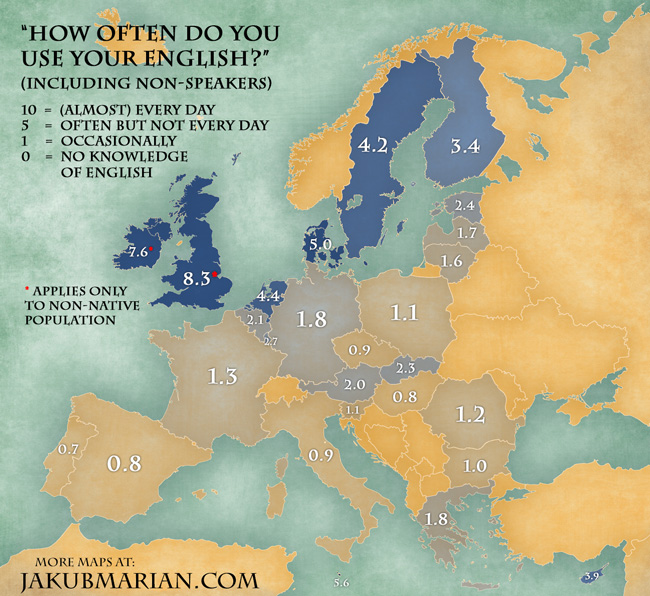 Languages How often do you use your English? December 14, 2015 Alex © Jakub Marian (overlay), Tindo – fotolia.com (blank map) Via jakubmarian.com Related Posts:Best Geography, Map, and Travel Adult Coloring BooksEnglish Accents and Dialects Around The WorldThe Most Spoken Languages in American States and…How English Proficiency Changed Worldwide: 2015 vs 2023English language in the worldEnglish Proficiency in EuropeForests and Human Settlements: A Visual ExplorationLanguages of the British Isles throughout history
