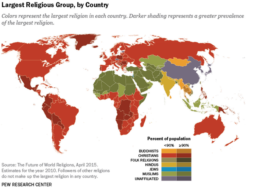 Maps of World ReligionsWorld Largest religious group, by country June 24, 2015 Alex Color represent the largest religion in eacn country. Darker shading represents a greater prevaltnce of the largest religion. Related Posts:Chickens Live stock data by countryThe Price of Sex around the World MappedThe Richest Person in Every US StateTemperature Converter: Fahrenheit, Celsius & KelvinThe Intrinsic Value of DemocracyHomicide Rate in the United StatesThe Human Development Index of US vs. EuropeReligiosity in the United States