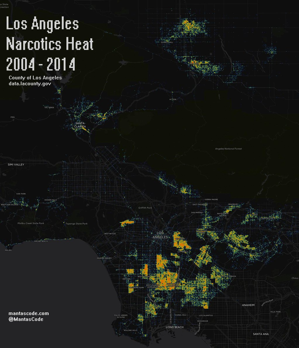 CitiesCrime maps Los Angeles narcotics heat (2004 – 2014) January 27, 2016 Alex Related Posts:Los Angeles mapsThe cleanliness of Los Angeles streetsWhere are L.A.'s dirtiest streets?US subdivisions, equivalent population to Los Angeles CountyNeighborhood Racial and Ethnic Change Trajectories…Mapping Every City and Neighborhood in Greater Los AngelesThe 27 EU Countries Ranked by Size: From France to MaltaThe Most Affordable ZIP Codes to Buy Property in…