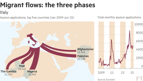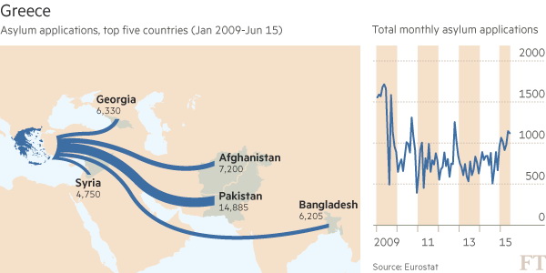 The largest group of people reaching Europe through the Mediterranean or the western Balkans are Syrians fleeing a civil war, but there are also many from Eritrea and Afghanistan, as well as Kosovo and Nigeria. The Financial Times examines the flows of people, their asylum applications and the EU’s relocation proposals.