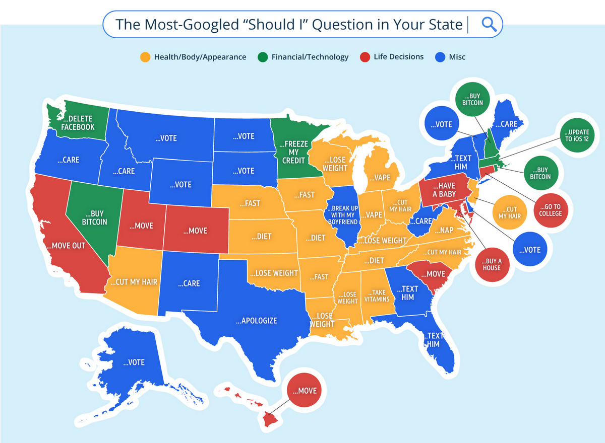 According to the map, the question ‘Should I vote?’ is the most popular question in the U.S. states. Following it the most popular questions are ‘Should I lose weight?’ and ‘Should I care?
