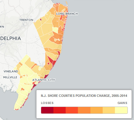 While New Jersey increased in population by nearly 3 percent from 2005 to 2014, the average town along the coast experienced a 9 percent decline, a NJ Advance Media review of Census data found. That shift likely reflects major issues in Sandy recovery and the changing economic landscape of Shore towns.