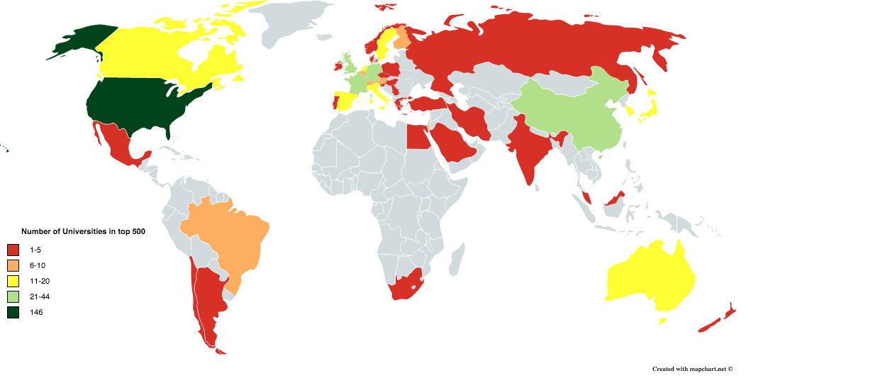 EducationWorld Number of Top-500 universities by country August 25, 2015 Alex Related Posts:Medieval universities in EuropeIvy League Universities: A Geographic Journey…The Most and Least expensive universities in the USAWhere did each country's head of government obtain…The Type of Business Every Country Wants to StartNumber of universities in the Top 500The Oldest School In Every Country MappedEvery recorded meteorite to have struck Earth mapped