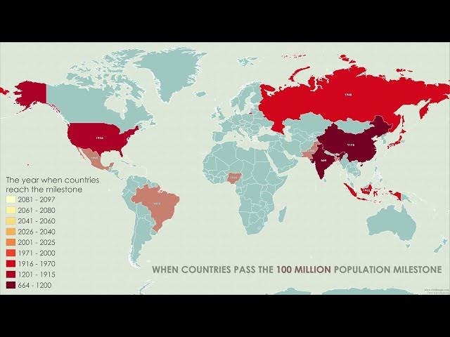 Reaching the 100 million population milestone is significant because it frequently indicates a nation's expanding economic potential, influence, and global reach. Watch the timeline as each nation reaches (or is expected to reach) 100 million people on this animated world map. Read more: https://vividmaps.com/when-nations-crossed-population-milestones/ Here are some beautiful and educational world maps on Amazon that geography lovers might enjoy: (As an Amazon Associate, I earn from qualifying purchases. These links lead to Amazon.) π World Map Poster β Classic Vintage Style: https://amzn.to/3HbXyoj π Scratch-Off World Map β Track Your Travels: https://amzn.to/43CpvNJ π World Political Map β Laminated Wall Edition: https://amzn.to/43CM5pB