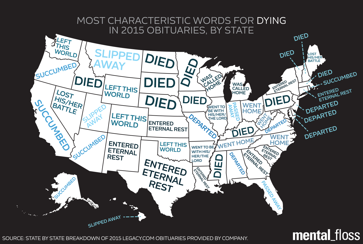 “Passed away” was used in 32.5 percent of all obituaries and topped the national list. In every single state, it was either “passed away” or “died” (20.6 percent nationwide at №2) that was used most often. The relative prevalence of each of these terms paints a much more diverse picture.