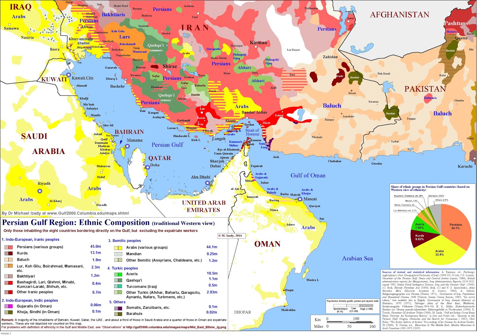 Izady’s map suggests Persians make up a slight plurality, at ~34 %, with Arabs just behind at ~33 %.That closeness suggests that Persian and Arab groups are similarly prevalent along the Gulf shores.