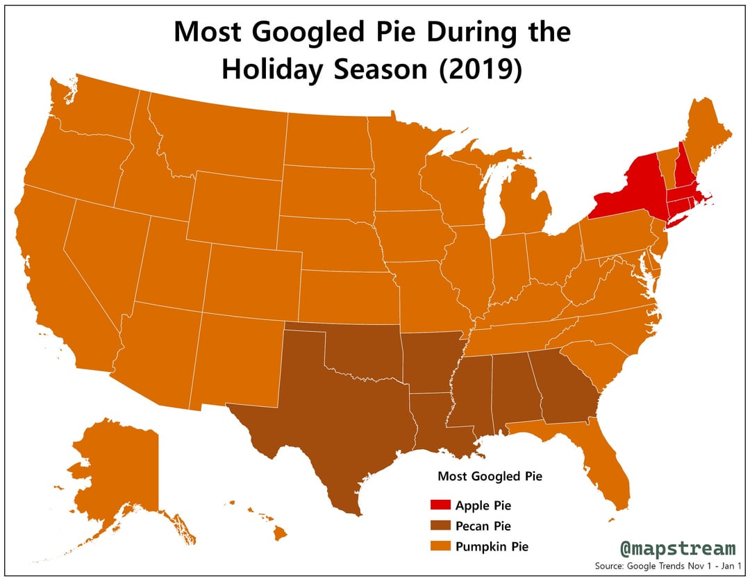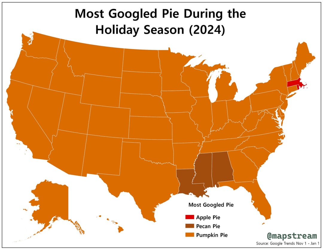 @mapstream used Google data on pie searches, covering the period from the start of November through New Year’s for both 2019 and 2024, to create the following maps