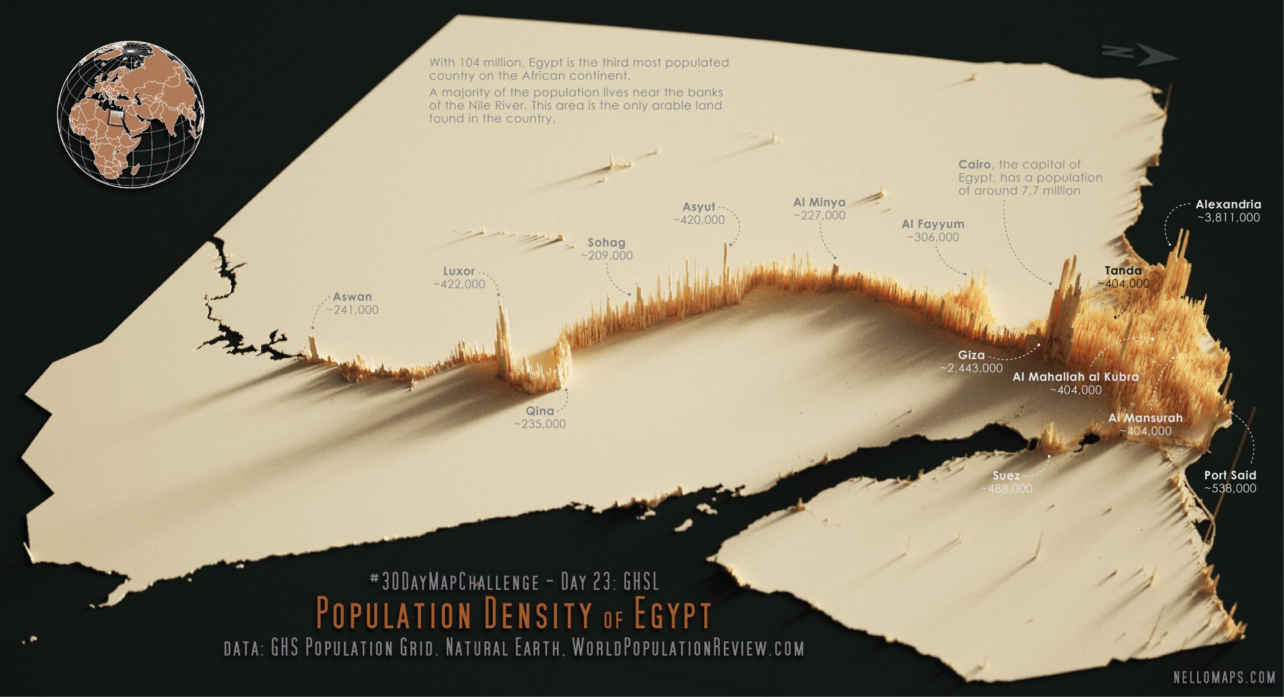 Julian Hoffmann and Nelson Schäfer created fascinating 3D maps that visually emphasize the population’s concentration along the Nile. The vertical spikes reflect the dramatic density differences between the Nile Valley and the surrounding desert.