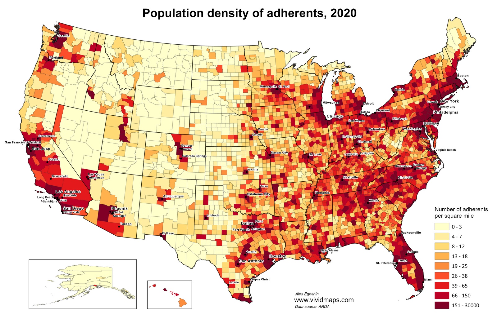 To make those numbers easier to picture, I used ARDA data to create a map showing the number of religious adherents per square mile in each county. In my opinion, the result is a kind of population-density map — but instead of counting everyone, it only counts people linked to congregations.