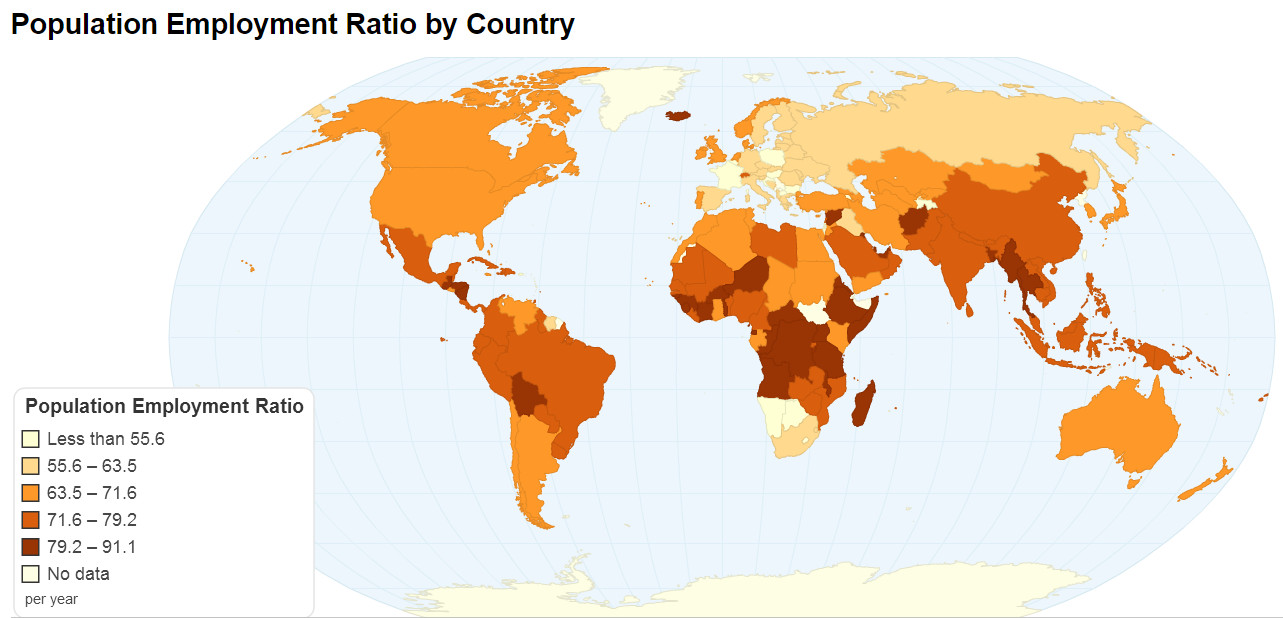 Economic mapsWorld Population Employment Ratio by Country June 23, 2015 Alex Related Posts:Population employment ratioThe most viral video in each U.S. stateSex Ratio by U.S. CountyPercent of population with a disability by U.S. countyWhich US States Have Recovered from RecessionThe ratio of single men to womenWater, jobs and food securityU.S. Population Density Mapped