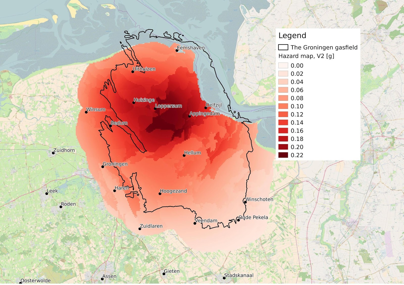 Seismological hazard map of Groningen (Netherlands)