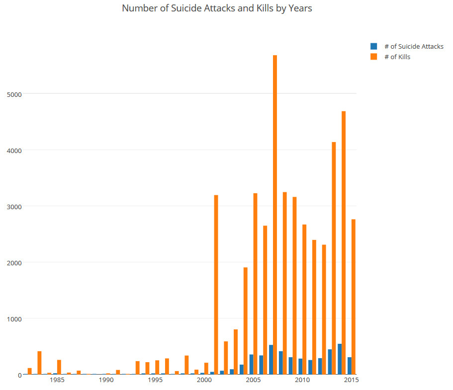 CartoDBChartsInteractive maps Suicide bombings between 1982 – today November 15, 2015 Alex Via sayiyon.com Related Posts:Suicide Rates by Country MappedSuicide mortality in the U.S. mappedSuicide death rates mappedSum of average temperatures & suicides in EuropeThe World’s most depressing place namesSilicon Valley, 1982: A Technicolor Time CapsuleSelf-Inflicted Deaths by Country21 maps that explain Russia