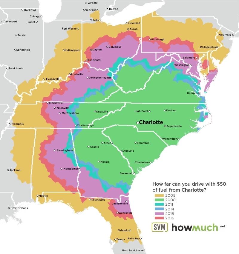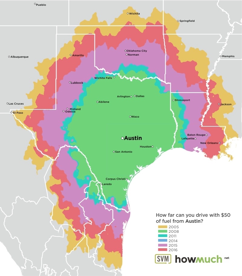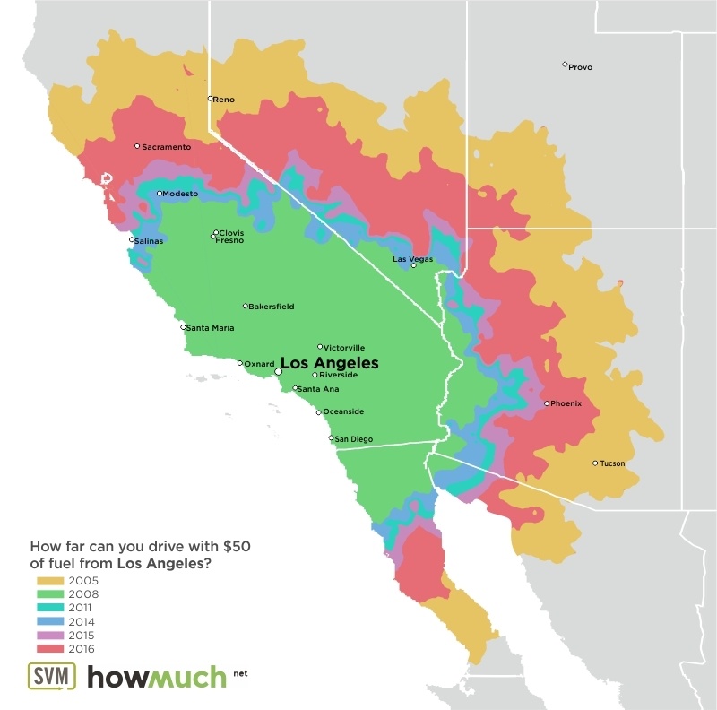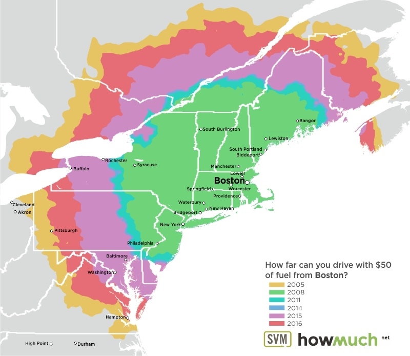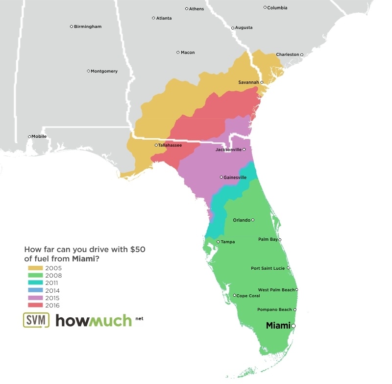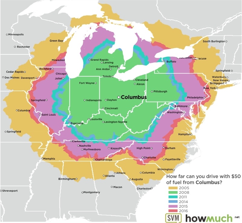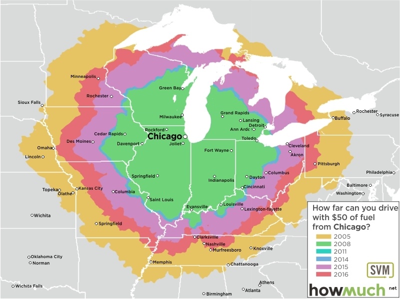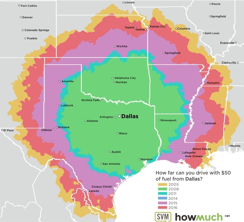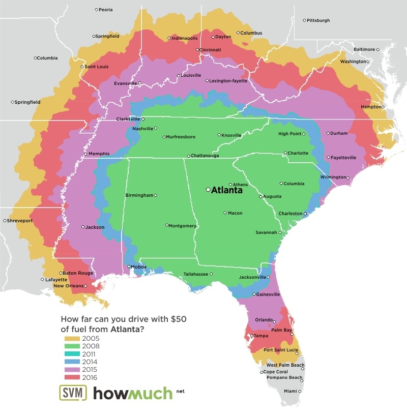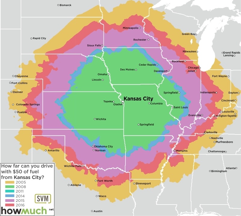 These maps, each centered on a great American city, are as many time travel maps. Using data from the June months of 2005, 2008, 2011 and 2014 through 2016, maps indicate how far that $50 tank of gas would get you – assuming your car’s fuel efficiency is 24 miles per gallon.