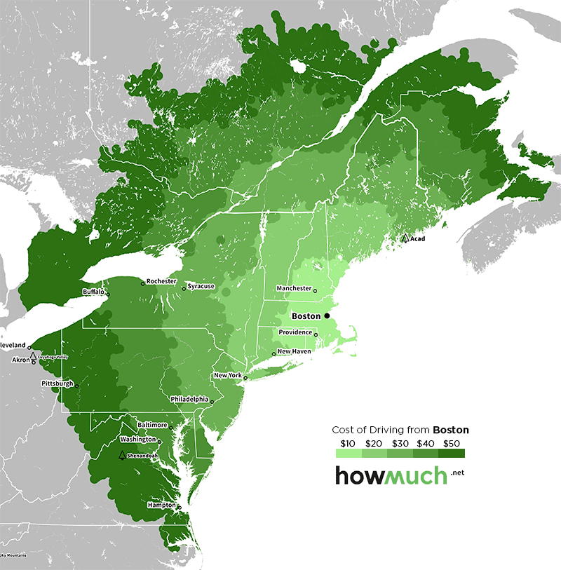 Put $50 of gas in your tank. How far do you get? With fuel prices this low, quite a distance. But don’t try to hit Miami Beach from downtown Atlanta, though: your tank will run dry by Pompano Beach, with still 35 miles to go. So where do you take your sweet new ride for a long weekend? Assuming there’s a gas station in the centre of each of the major cities depicted here – yes, statistics is a funny business – this is how far a $50 tank of gas will get you. This data is based on a car that consumes 24 miles per gallon.