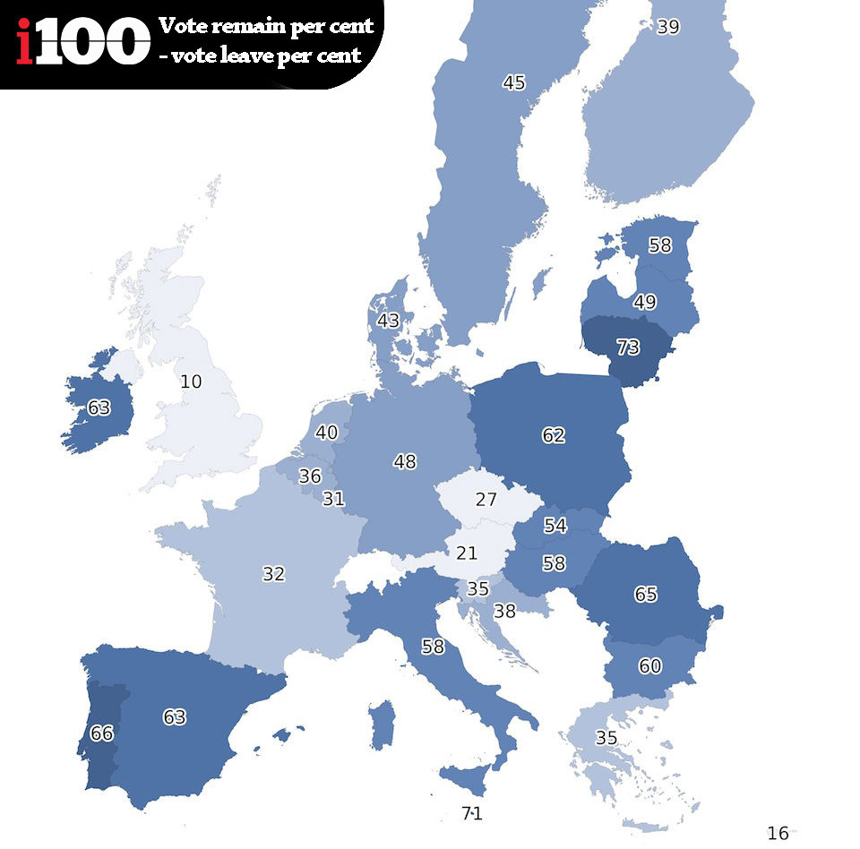 The indy100 have created the following graphic based on the data. In the map, the darker the shade of blue, the more support there is in that country for the UK to remain in the EU. The scores are calculated by subtracting the percentage of people who want Britain to leave, from those who want Britain to remain.