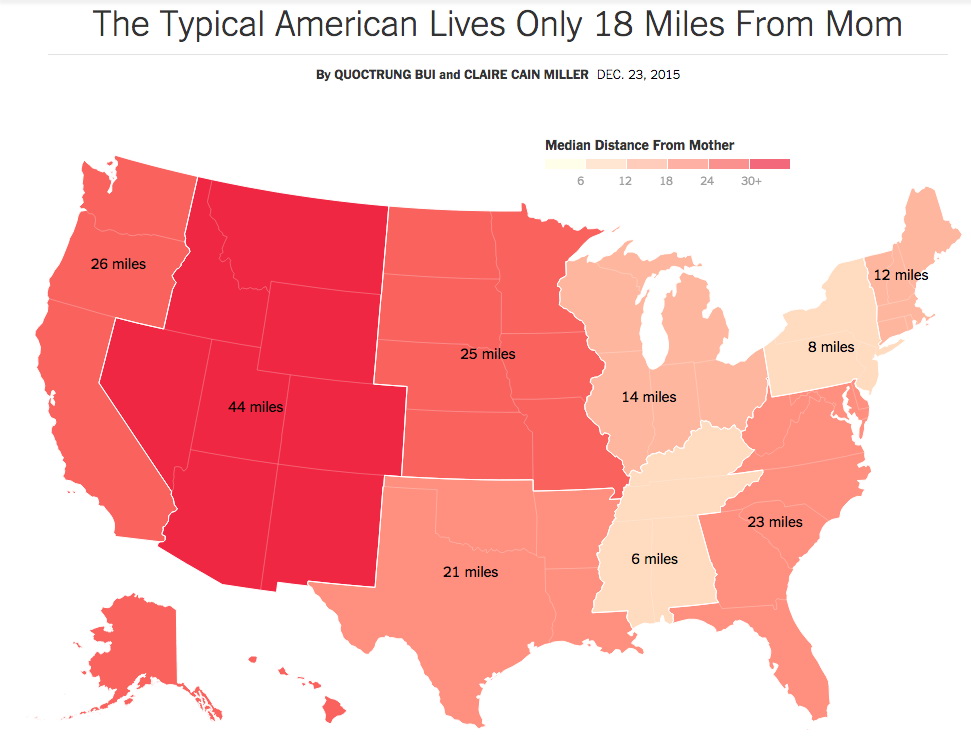 Cultural cartography The typical american lives only 18 miles from Mom January 24, 2016 Alex Related Posts:Mom-related terms each state Googles more than any otherThe typical American lives only 18 miles from momMaps of the Great LakesPredominant ancestry in the U.S.The Oldest Cities in the U.S. MappedWhere Nobody Lives: Maps of Earth's Uninhabited and…The Most Affordable ZIP Codes to Buy Property in…The Distance of States' Capitals From Their Centers…