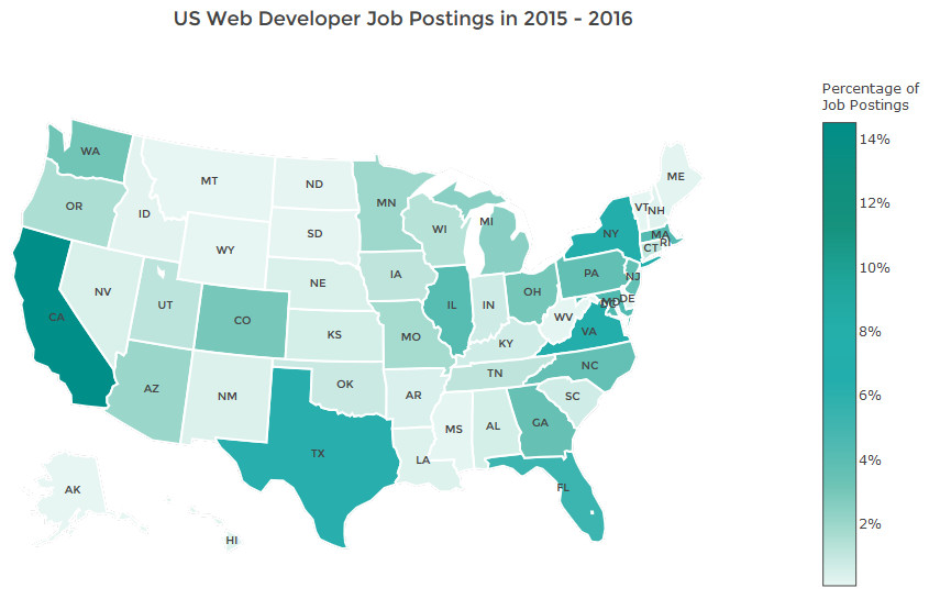 1. California (In 2015 and 2016, 14.44% of US web developer job postings were in Californiahttps://careerscore.com/insights)