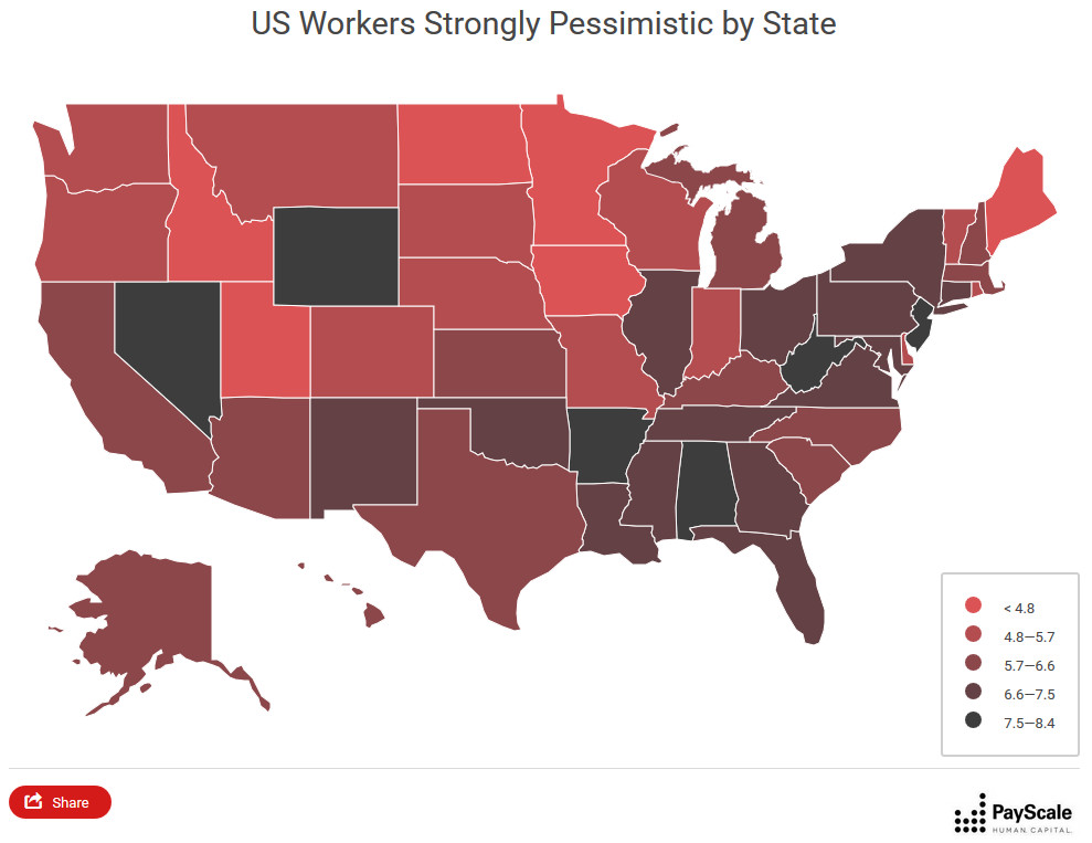 Wyoming and West Virginia follow New Jersey as the number two and three states with the highest percentage of workers reporting pessimism in their employer’s future.
