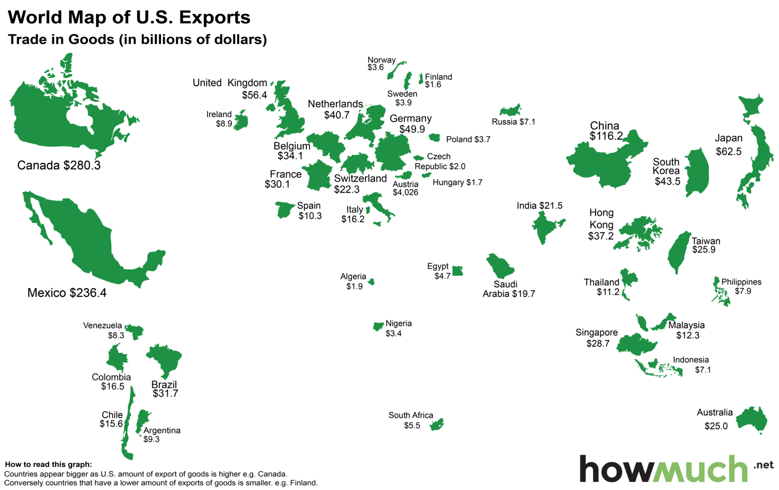 CartogramsEconomic maps Visualising US Exports and Imports June 20, 2016 Alex World map of US trade balance World map of US exports World map of US imports Via www.howmuch.net Related Posts:Maps Reveal Each U.S. state's Biggest Export – and…Global Trade Dominance: How China Overtook the EU…Every State's Top Import and Export MappedHow Long It Would Take To Pay Off The Average Credit…Countries with the largest exports in 1990 vs. 2021…Countries by ImportsEurope’s Trade Map: How Its Biggest Partners Changed…Global Arms Trade Network