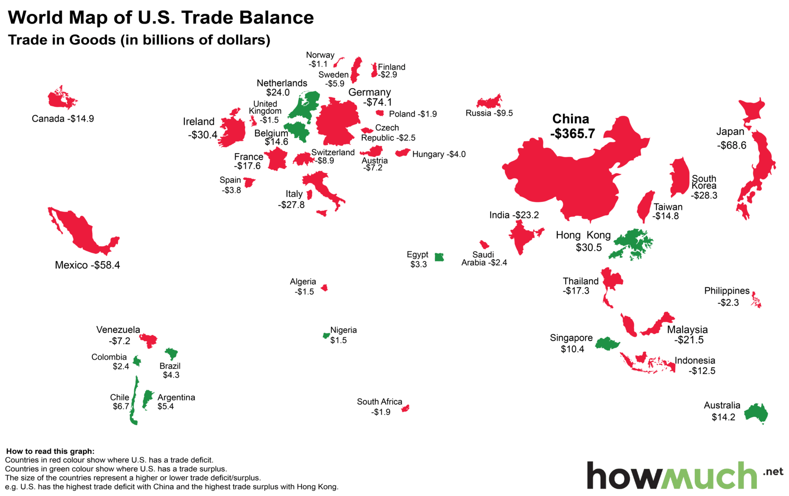 CartogramsEconomic maps Visualising US Exports and Imports June 20, 2016 Alex World map of US trade balance World map of US exports World map of US imports Via www.howmuch.net Related Posts:Maps Reveal Each U.S. state's Biggest Export – and…How Long It Would Take To Pay Off The Average Credit…Global Trade Dominance: How China Overtook the EU…The Richest Person in Every US StateEvery State's Top Import and Export MappedCountries with the largest exports in 1990 vs. 2021…Europe’s Trade Map: How Its Biggest Partners Changed…The Dramatic Shift in Global Trade: How China…