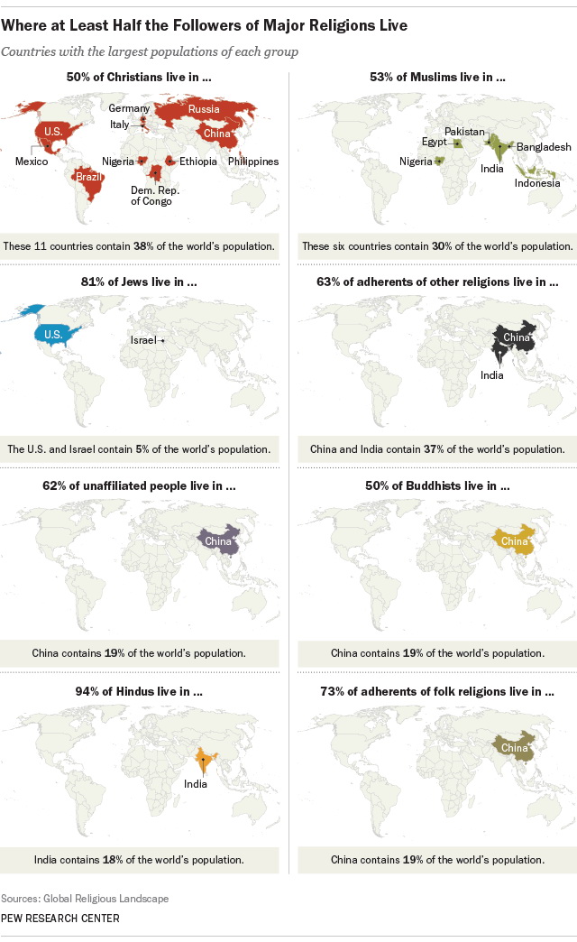 World Where at least half the followers of major religions live? January 5, 2016 Alex Via pewresearch.orghttp://www.pewresearch.org/fact-tank/2014/08/27/many-religions-heavily-concentrated-in-one-or-two-countries/ Related Posts:The World's Forests MappedThe Most Affordable ZIP Codes to Buy Property in…How the World was Imagined: First Maps and AtlasesThe Most and Least Expensive American Neighborhoods3D Mapping of The Global ClimateHalf of the French live in the blue areasItaly`s population split in halfThe same amount of people live in the black & in the…