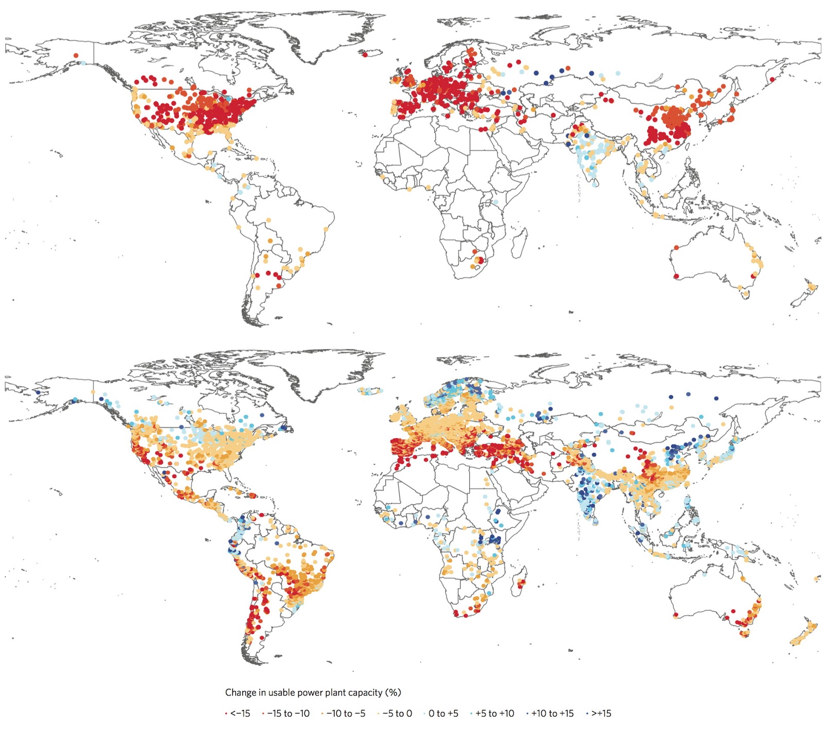 Impacts of climate and water resources change on annual average usable capacity of existing traditional power stations (upper map) & hydropower plants (lower map). Results are for the 2050s (2040-69), under a high emissions scenario (RCP8.5) & relative to 1971-2000. Source: van Vliet et al. (2016).