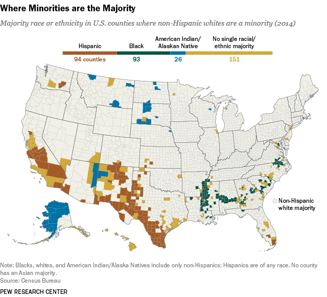 Migration maps Where minorities are the majority July 7, 2015 Alex Majority race or ethnicity in U.S. counties where non-Hispanic whites are minority. Related Posts:Where Racial Minorities Make Up a Significant Share…Geography Facts About the U.S. CountiesU.S. counties where racial and ethnic minorities…The Peoples of ChinaLeading minority group by U.S. countyU.S. Non-Hispanic White Population by County (1990 - 2017)The World’s Minority Indigenous PeoplesRace and ethnicity map of New York City