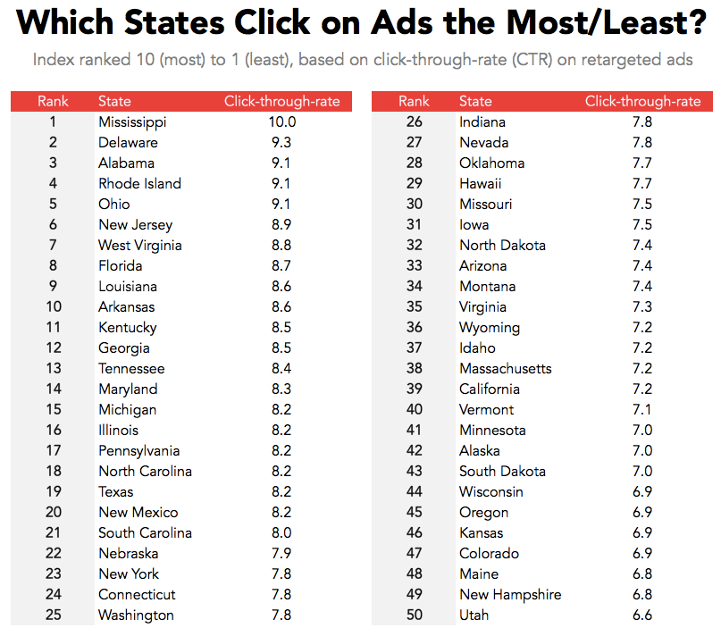 Economic mapsInternetMapping StereotypesWorld Which states click on ads the most? March 26, 2016 Alex Via priceonomics.com Related Posts:Topics of Political Ads by U.S. Region (Midterm…The Best World Atlases in 2025The 30 Best Map-Based Strategy Board GamesThe Best Editions of Monopoly Board GameThe Best World Map Posters In 2025Other popular board gamesHighest-Paid Instagram Celeb In Every U.S. StateThe Best Scratch-Off Maps in 2025