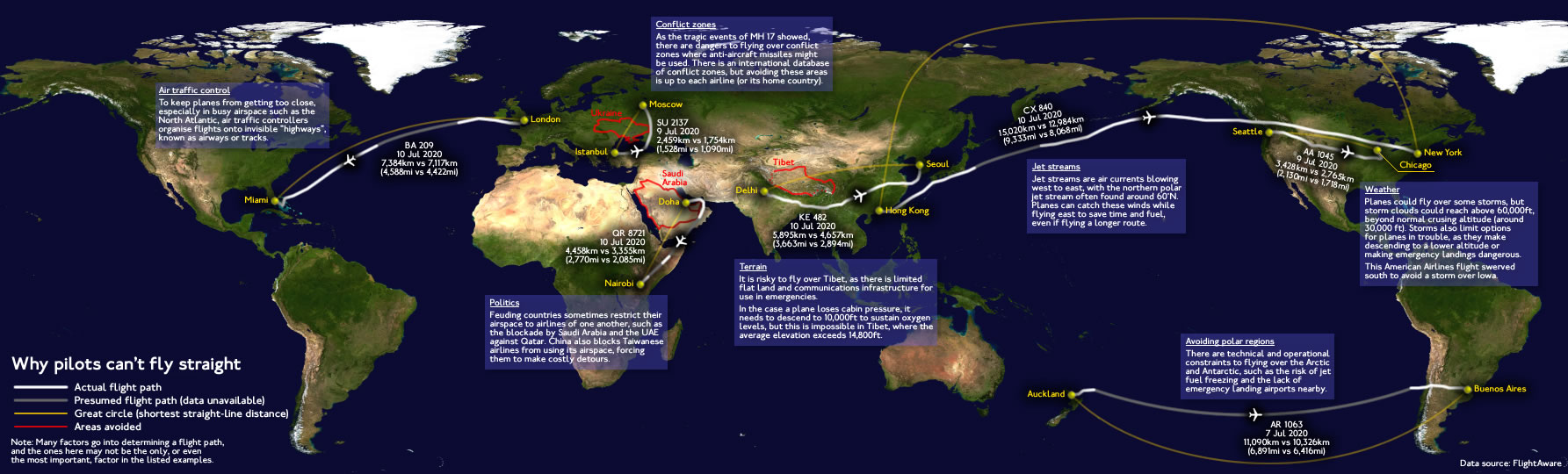 A flight following one of these routes would take roughly 22 to 23 hours of continuous flying. But most commercial flights don’t even follow these theoretically shortest paths. They deviate even more, sometimes by hundreds of miles. The map below shows why.