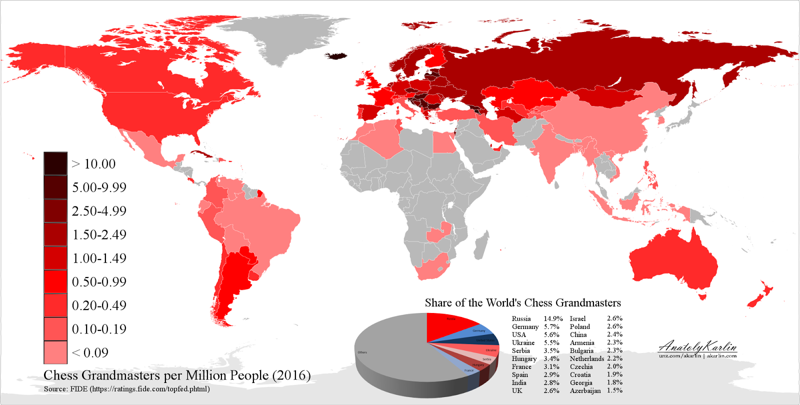 World World Map of Chess Grandmasters (2016) December 3, 2016 Alex Related Posts:The Spread of ChessHow the World was Imagined: First Maps and Atlases2016 U.S. presidential election mappedRandom states of AmericaU.S. presidential election results in two maps (2016)Change in margin between 2004 & 2016 electionsThe Best World Map Posters In 20253D map of county-level election results
