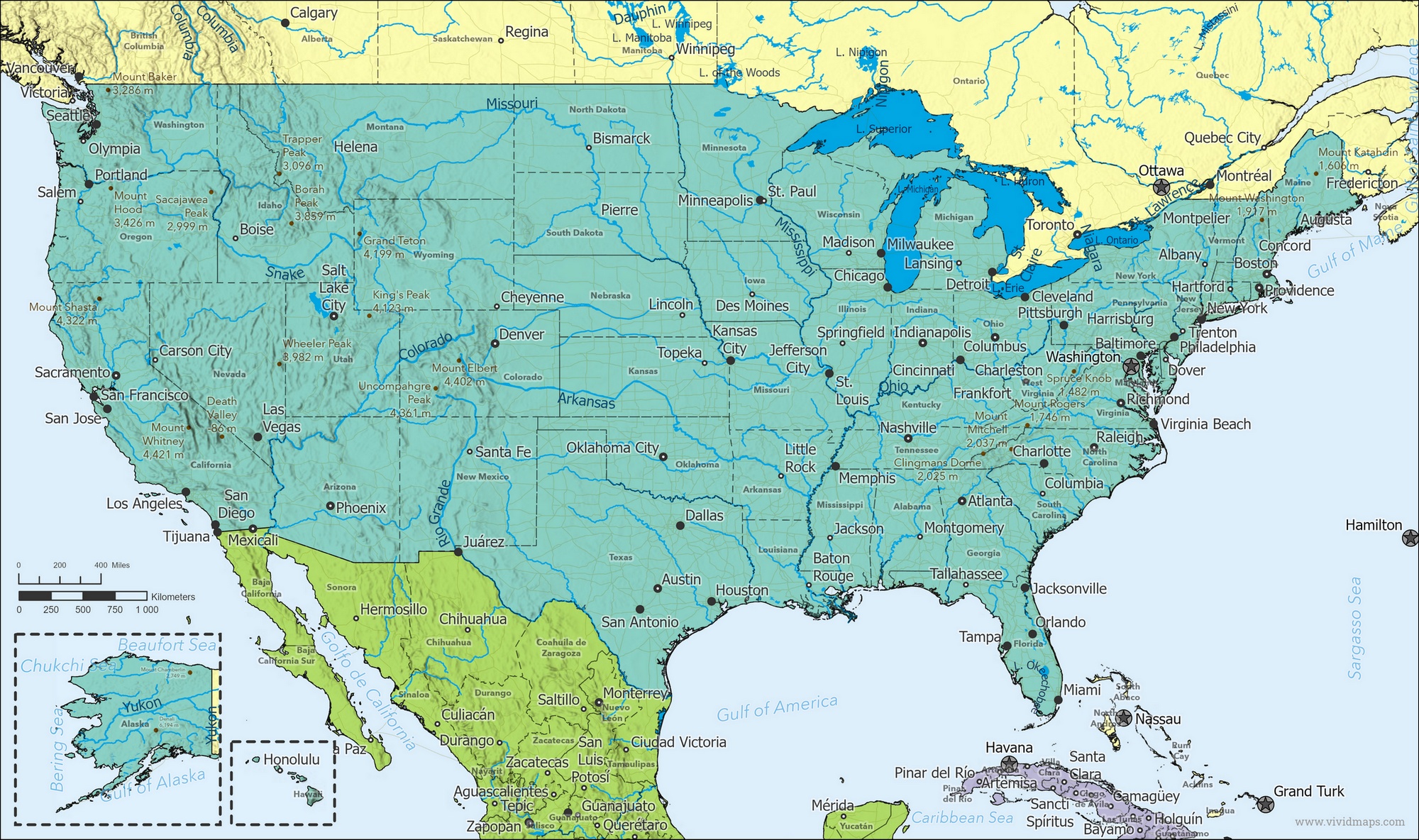 Major rivers (by length): Missouri – 3,768 km (2,340 mi); Mississippi – 3,544 km (2,202 mi); Yukon river mouth (shared with Canada [s]) – 3,190 km (1,982 mi); Saint Lawrence (shared with Canada) – 3,058 km (1,900 mi); Rio Grande river source (mouth shared with Mexico) – 3,057 km (1,899 mi); Colorado river source (shared with Mexico [m]) – 2,333 km (1,449 mi); Arkansas – 2,348 km (1,459 mi); Columbia river mouth (shared with Canada [s]) – 2,250 km (1,398 mi); Red – 2,188 km (1,360 mi); Ohio – 2,102 km (1,306 mi); Snake – 1,670 km (1,038 mi)